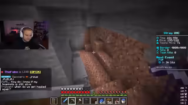 03:09:57Der Stream beginnt mit der Planung eines 1-gegen-1-Duels gegen einen Spieler namens Ramo, das vor einem bevorstehenden URC-Event stattfinden soll. Kurz darauf gibt es technische Probleme mit dem RTP (Random Teleport), das nicht funktioniert, was den Start verzögert. Der Streamer kontaktiert einen Spieler namens Goaty über Discord, der sich als Gegner für das Duelle anbietet. Nachdem seine Basis von einem anderen Team geradet wurde, wird ein spontanes 1-gegen-1-Duell mit Goaty ausgehandelt, das vorrangig stattfinden soll.