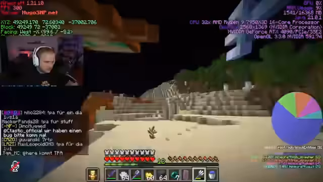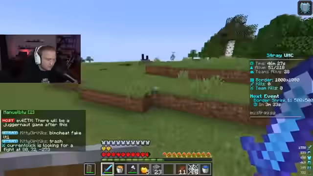 04:27:18Der Streamer startet alleine in Minecraft und ist verwirrt über die Anzahl der Mitspieler – er schätzt acht oder drei, während er seine eigene Nüchternheit infrage stellt. Er bemerkt, dass er in einem Cross-Team ist, und diskutiert mit seinem Chat über 'Nerd in the Dirt', ein Survival-Format von Trimax. Während er strategisch überlegt, ob er in den Nether gehen oder unter dem Radar bleiben soll, kritisiert er ein als 'Kinderverarsche' bezeichnetes 1000x1000-Schwingt. Er betont die Wichtigkeit, sich zu verstecken, etwa auf Bäumen, um nicht entdeckt zu werden.