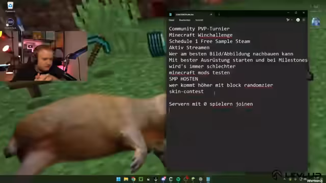 02:19:41Der Streamer startet eine interaktive Content-Planungsphase. Er hat über Instagram von seinen Followern Ideen für zukünftige Streams und Inhalte erhalten und liest diese nun vor. Die reichen von ernsthaften Vorschlägen wie einem Community-PVP-Turnier oder einem neuen Minecraft-Herausforderungsmodus („Beste Ausrüstung starten, die bei Meilensteinen schlechter wird“) bis zu skurrilen und humorvollen Ideen, wie zum Beispiel „ Kraft-Attack-Streamer angreifen und in das Koma schlagen“. Er sammelt die konstruktiven Vorschläge, um sie in Zukunft umzusetzen.