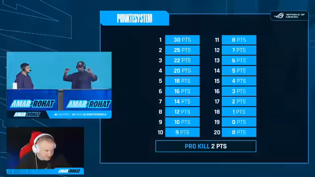 00:27:54Während des Streams laufen organisatorische Dinge im Hintergrund ab. Es wird das Punktesystem erklärt: Placement zählt, Kills während der Show-Runden werden mit dreifachen Punkten belohnt. Ein Team, das die speziellen Lama-Skins eliminiert, erhält 1000 Euro Preisgeld. Zudem gibt es spezielle Runden, wie die Pickaxe-only-Runde. Streamer und Zuschauer interagieren, während das Team auf den nächsten Drop wartet und die Konkurrenz analysiert.