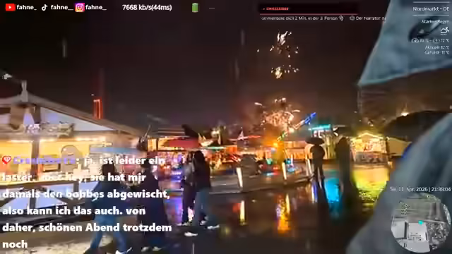 02:59:50Die Streamer sind auf dem Weg zu einer Kirmes, um dort ein Höhenfeuerwerk zu erleben, das für 21:30 Uhr angekündigt ist. Der Weg dorthin wird mit technischen Herausforderungen, wie dem Suchen von Parkplätzen, verbunden. Bei der Ankunft werden die notwendigen Sicherheitsvorkehrungen und die Planung für den weiteren Verlauf des Abends besprochen. Abschließend wird die Ankunft am Zielort, der Kirmes, und die Freude über das Event betont.