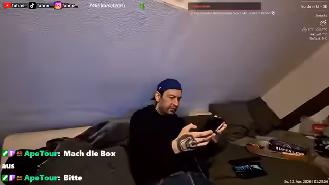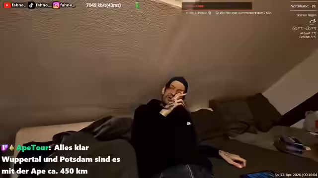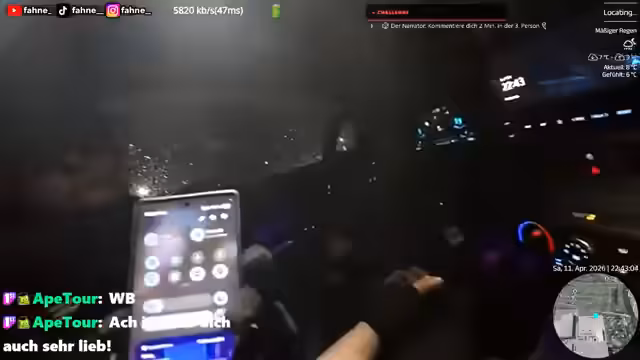 02:22:43Es wird über das aktuelle Wetter gesprochen, insbesondere über die Ankunft von Gewitter und Regen. Die Streamer diskutieren ihre technische Ausstattung, einschließlich des Setups mit Kamera, Akku und Mikrofon. Es gibt technische Schwierigkeiten, wie die Anpassung der Display-Ansicht und das Verwalten von Verbindungen. Der Einsatz von Powerbanks und die Abstimmung zwischen Bild und Ton sind zentrale Themen.