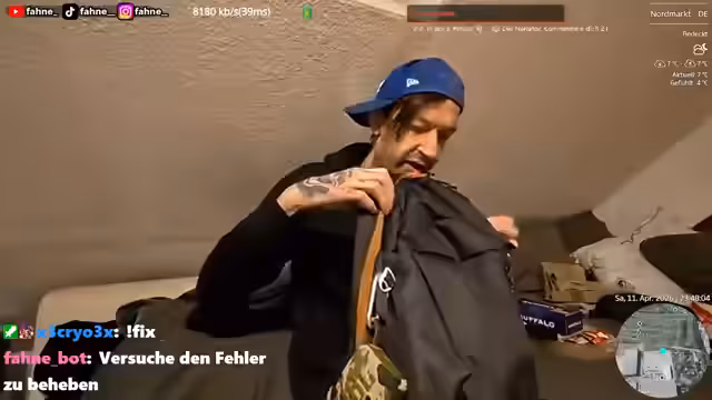 08:10:26Der Streamer kündigt ein Gewinnspiel an. Er möchte seine eigenen Schuhe an die Community verlosen, die von seiner Freundin Tammy für ihn gekauft wurden. Dies ist eine interaktion Aktion, um die Zuschauer einzubeziehen. Gleichzeitig berichtet er über geplante Inhalte für den Kanal, wie das Drehen eines Sponsor-Videos für die Webseite meinimpressum.de, das jedoch wegen des wetters und der technischen Vorbereitung verschoben wird.