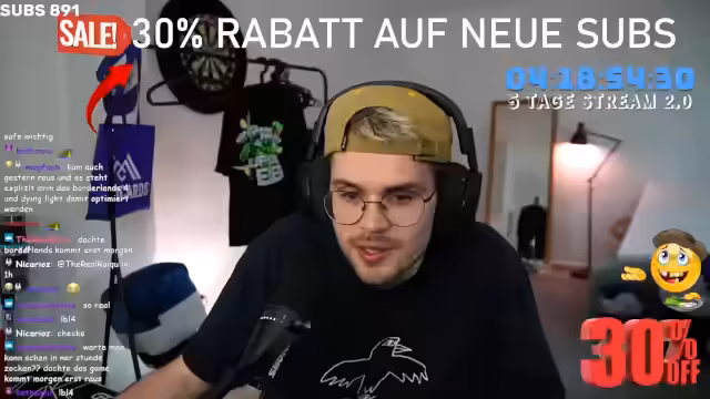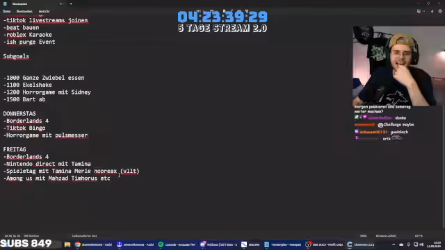 00:05:42Der Streamer startet in einen 5-Tage-Stream und stellt klar, dass dies ein valides Event ist, das 5 Tage dauern wird. Der heutige Plan ist, in Borderlands 4 mit Stegi einzusteigen und den Tag voll zu zocken. Es wird auch ein Placement am 16. geben, was bedeutet, dass er für eine kurze Zeit offline gehen könnte. Für die Subs gibt es Belohnungen, wie das Essen von 1000 Zwiebeln bei 1000 Subs und das Abschneiden des Bartes bei 1500 Subs, wobei er letzteres für ungültig hält.