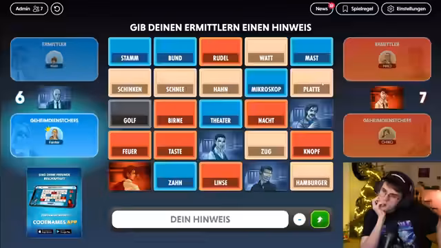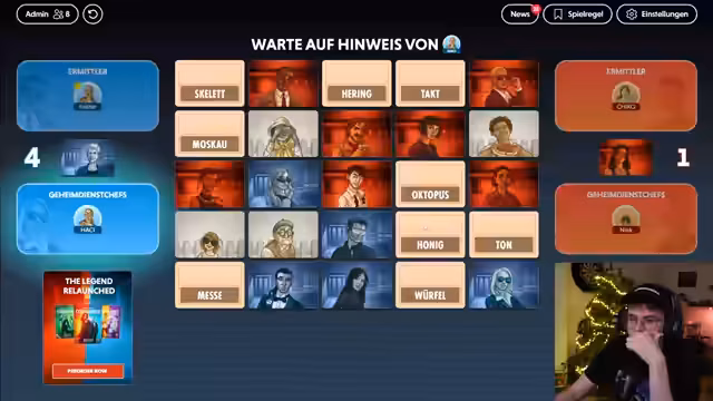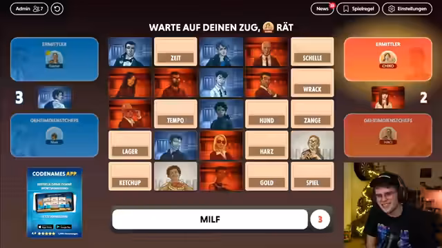 03:35:16Eine Runde endet mit einem Fehler des Ermittlers, der ein neutrales Wort wählt, wodurch das gegnerische Team das Spiel gewinnt. Die Teams wechseln anschließend die Rollen: Die bisherigen Ermittler werden Geheimdienstchefs und umgekehrt. Ein Spieler verlässt kurz den Stream, was zu einer Wartezeit führt. Die verbliebenen Teilnehmer nutzen diese Zeit, um über den Spielverlauf und die Qualitäten ihrer Mitspieler zu diskutieren.