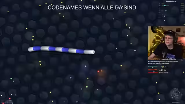 01:11:23Während die Spieler für Codenames noch nicht vollständig anwesend sind, entscheidet sich der Streamer, ein Runde des Browsergames Slither.io zu spielen. Das Spiel sorgt für intensiven und unterhaltsamen Content, bei dem er mehrere Spieler eliminiert und sich mit der Community austauscht. Dieses Spiel dient als Zeitvertreib und hält die Spannung, bis das eigentliche Hauptevent starten kann.