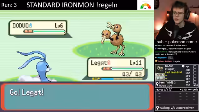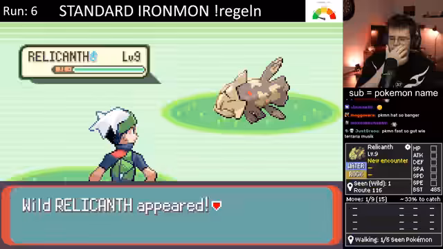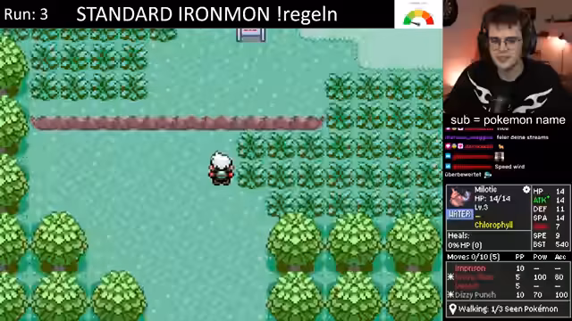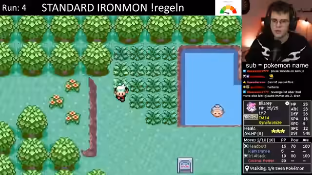 01:37:44Der Stream beginnt mit dem Ironmon Run. Der Streamer wählt ein mittleres Pokémon, das sich später in Onix entwickeln wird. Nach anfänglicher Verwirrung über dessen Fähigkeiten und Schwächen entscheidet er sich für dieses Pokémon. Er beschwert sich über die generische Base-Stat-Total (BST) von 380 und kritisiert den mangelnden Schaden, den die meisten Attacken verursachen. Er beginnt mit dem Gameplay und stellt ein technisches Problem an den Anfang, indem er nach einer Möglichkeit fragt, wie man die Ingame-Sounds von der Musik trennen kann.