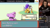 00:44:59Der Streamer beginnt mit dem Ironmon-Run in Pokémon Emerald. Er erklärt noch einmal die Kernregeln, wie zufällige Basis-Stats, Fähigkeiten und der verstärkte Schwierigkeitsgrad. Das Spiel wird auf 150% Geschwindigkeit beschleunigt, und der Ingame-Sound ist stummgeschaltet. Er wählt ein Maschak als erstes Pokémon, obwohl es nur Level 3 ist, und erhält später ein Tyrock. Nach einem harten Kampf gegen einen Trainer mit einem starken Onyx stirbt sein Team und der erste Run endet.