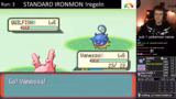 03:50:57Der Streamer beginnt einen neuen Versuch, der jedoch nach dem Rivalenkampf wieder scheitert. Er testet verschiedene Starter-Pokémon wie Needlearm und Zap Cannon, die aber beide unzureichende Basiswerte aufweisen. Ein Run mit Charnera wird nach einem Kampf verloren und ein weiterer Versuch endet ebenfalls mit einem Knockout, was den Streamer frustriert, da er sich bereits nach nur wenigen Runden in einem Kampf befindet, den er hätte gewinnen können.