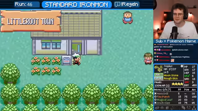 02:47:58Nach einem erneuten Ballonplatzen und einem provokativen Teilnehmer geht der Stream in den Gameplay-Teil über. Der Streamer stellt das Pokémon Ironmon als eine sehr schwere Challenge vor, bei der alles randomisiert ist. Die Regeln werden erläutert: Pro Route darf nur ein Pokémon gefangen oder getötet werden, bei einem Totalausfall muss das Spiel resettet werden und es dürfen nur Pokébälle und Schutzmittel gekauft werden. Der Streamer zeigt sich hochmotiviert und startet in das Pokémon-Spiel Emerald.