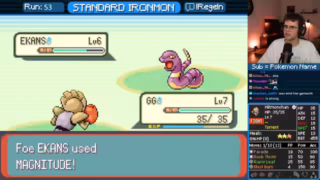 02:58:05Der Streamer beginnt mit dem Ironmon-Run, muss aber mehrmals resetten, da er keine starken Starter-Pokémon findet. Er beschreibt die Schwierigkeit, mit schlecht randomisierten Werten (BST) zu starten. Er fängt ein Pokémon, das als nicht optimal bewertet wird, und sucht nach besseren Optionen. Der Streamer analysiert die Stats und Attacken seiner Pokémon eingehend und zeigt sich frustriert über die unfairen Kämpfe, in denen er durch "One-Shot"-Kämpfe aus dem Rennen geworfen wird.