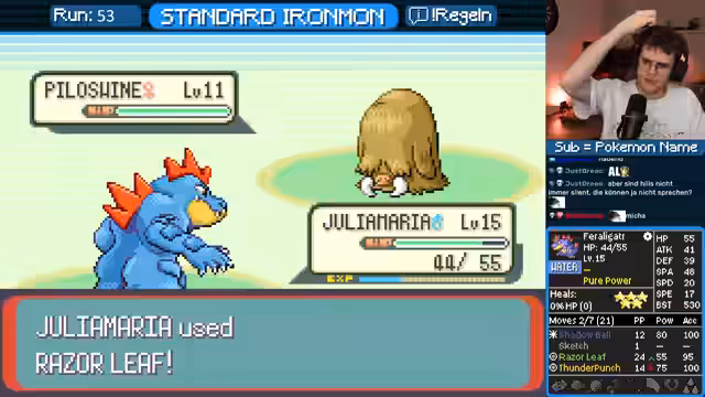 03:12:34Der Streamer setzt den Ironmon-Run fort, kämpft sich aber weiterhin durch schwere Kämpfe. Er analysiert seine Pokémon und deren Fähigkeiten, wie z. B. "Pure Power", die den Angriffswert verdoppelt. Es werden verschiedene Strategien besprochen, um mit den limitierten Pokémon überleben zu können, wie z. B. das Erlernen neuer Attacken. Der Streamer betont die besondere Schwierigkeit dieser Challenge, bei der auch die Gegner und Attacken zufällig sind.
