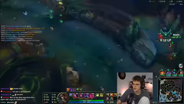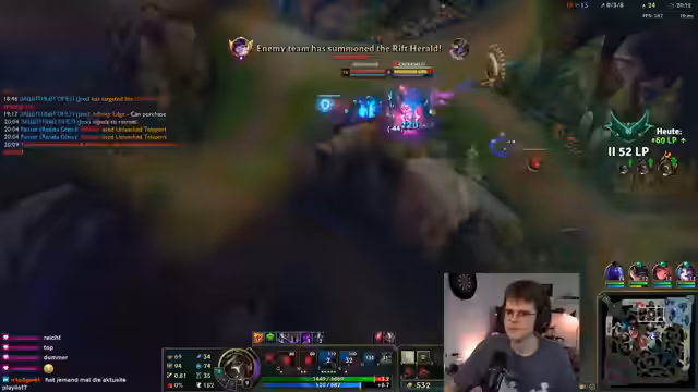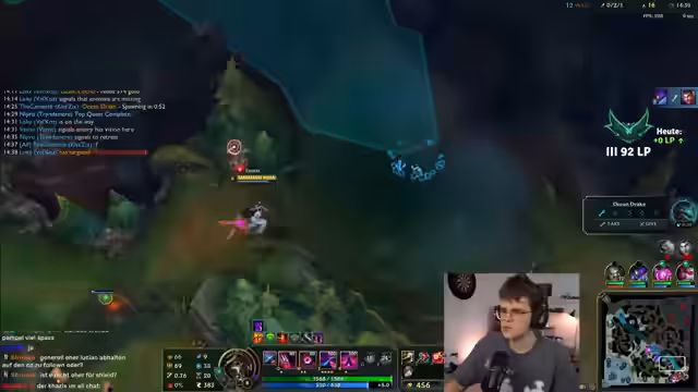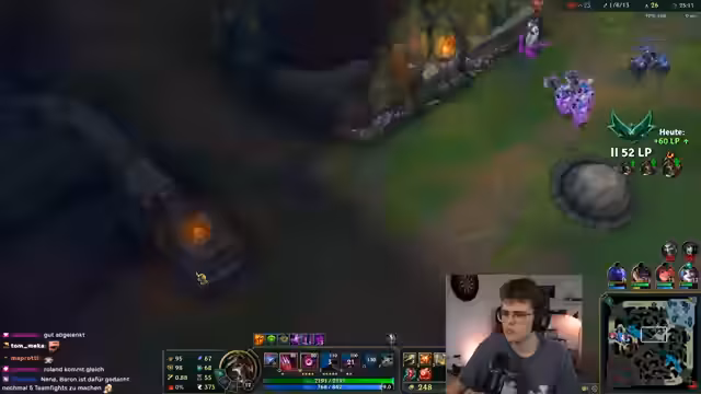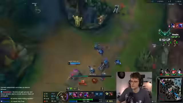 03:14:27Im weiteren Verlauf des Spiels fühlt sich der Streamer von seinem Team im Stich gelassen. Er ist frustriert über die fehlende Koordination und das Passive-Verhalten, insbesondere der Mid-Lane. Trotzdem versucht er, das Spiel zu kontrollieren und Vision zu nutzen, um Vorteile zu erzielen. Ein Fehler, der zum Tod führt, wird von ihm selbst analysiert und als eigene Schuld eingeräumt.