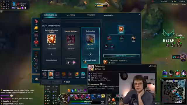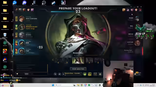 00:10:55Der Streamer kündigt an, heute ausschließlich League of Legends zu spielen, da er mittags am besten in der ist. Er gibt an, sich auf die Champions Renata und Fizz zu konzentrieren, um zu climpen. Er erklärt, dass er Renata pickt, wenn der Gegner einen engage-orientierten Support hat, und Thresh gegen poke-orientierte Supports. Aktuell befindet er sich auf Emerald 3, wird aber zuversichtlich, den Diamant-Rang zu erreichen, auch wenn die Winrate bei stabilen 50% liegt.