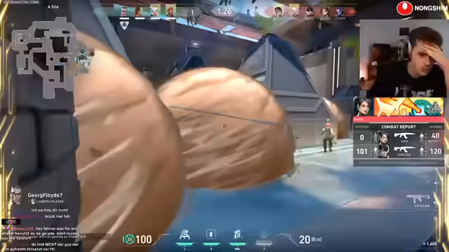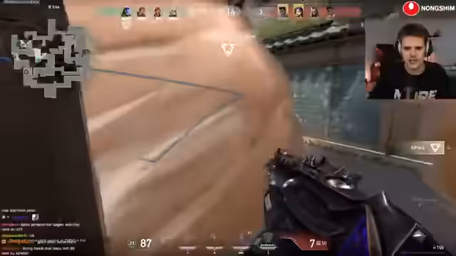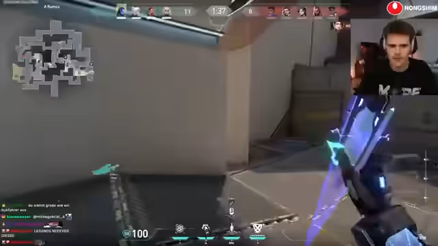 01:47:30Der Streamer spielt nun aktiv Valorant. Während des Spiels interagiert er mit dem Chat, kommentiert seine Aktionen und die seines Teams. Er wird während eines Duells eliminiert und äußert sich frustriert über sein Spielverhalten und die Leistung im Team.