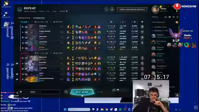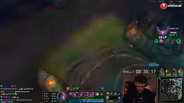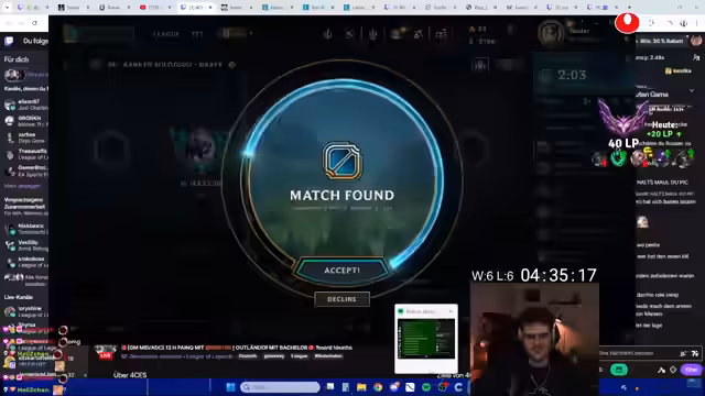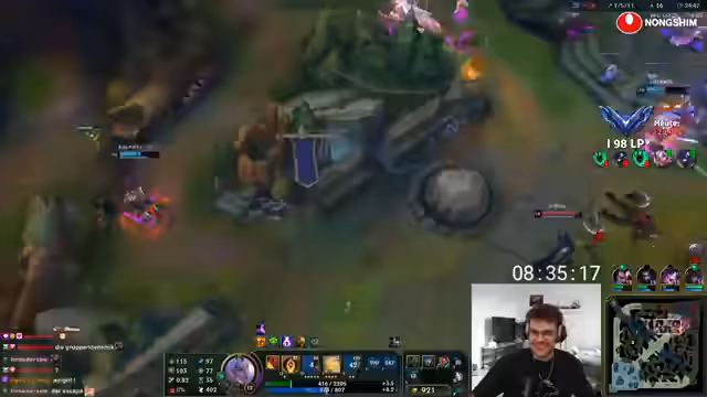 00:34:37Während des Streams werden die League of Legends-Spiele fortgesetzt mit Fokus auf Teamkämpfe und strategische Entscheidungen. Nebenbei teilt der Streamer persönliche Gedanken, unter anderem über seinen bevorstehenden Urlaub und aktuelle gesundheitliche Probleme. Die Zuschauerinteraktion bleibt hoch, während er über Game-Philosophie und die Emotionalität im Ranked-Modus spricht.
