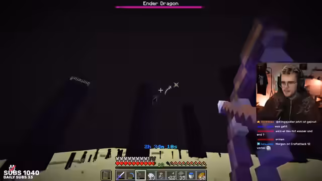 06:55:20Die Spieler bereiten sich auf den Kampf gegen den Enderdrachen vor. Es wird erklärt, dass sie auf einer Plattform spawnen werden und irgendwie zur Hauptinsel gelangen müssen, wo viele Endermen sind. Sie dürfen den Endermen nicht in die Augen schauen und können Wasser unter sich platzieren, wenn es kritisch wird. Der Enderdrache schießt lilafarbene AOEs auf den Boden, denen sie ausweichen müssen. Zuerst müssen die Kristalle auf den Türmen im End zerstört werden, da der Drache sich sonst regeneriert. Ein Spieler hat drei Stacks Pfeile, der andere erhält einen halben Stack. Nachdem alle Kristalle zerstört sind, können sie den Drachen angreifen. Sie kämpfen gegen den Drachen, weichen seinen Angriffen aus und schießen mit Pfeilen auf ihn. Ein Spieler wird von einem Enderman verfolgt und platziert Wasser unter sich, um sich zu schützen. Sie besiegen den Enderdrachen nach etwa 2,5 Stunden im Hardcore-Modus. Nach dem Sieg erscheint das Drachenei. Es wird erklärt, dass man das Drachenei nur bekommt, indem man eine Fackel darunter platziert, nachdem es gespawnt ist. Das Sammeln des Dracheneis wird wahrscheinlich Punkte für ein Event geben. Die Spieler beschließen, als Nächstes eine Elytra zu holen, da dies ebenfalls wichtig ist und das Fliegen damit Spaß macht. Sie sind begeistert, Minecraft zum ersten Mal durchgespielt zu haben, besonders mit der guten Ausrüstung, die sie gesammelt haben.
