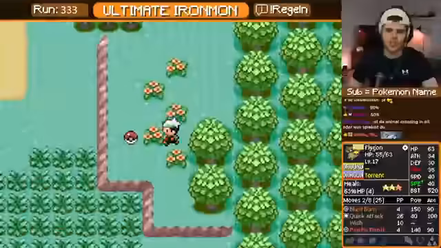 01:49:17Aufgrund der negativen Erfahrung mit dem Start in Elden Ring, entscheidet sich der Streamer spontan für einen Wechsel des Spiels. Er wählt Ironmon, eine zufallsgenerierte Variante von Pokémon aus der dritten Generation. Die Regeln sind anspruchsvoll: alle Fähigkeiten und Attacken sind randomisiert, Gegner sind stärker und der Spieler darf pro Route nur ein Pokémon fangen oder töten. Dieser Wechsel symbolisiert den Wunsch nach einem stressfreien und angenehmen Streaming-Erlebnis.