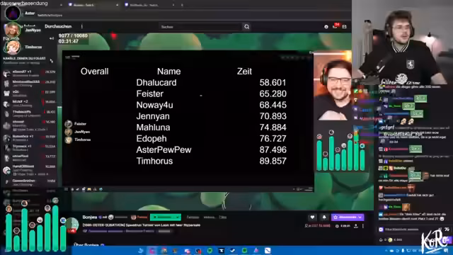 05:10:14Der Stream nähert sich seinem Ende, mit den letzten Maps als Abschluss des Wettkampfs. Das Punktesystem erweitert sich um einen Mario-Party-Stil, bei dem Bonuspunkte für verschiedene Kategorien wie die meisten zweiten Plätze oder die höchste Gesamtzeit vergeben werden. Dies sorgt für zusätzliche Spannung, da die endgültige Platzierung der Spieler durch diese Boni noch ändern kann, selbst wenn die regulären Punkte bereits vergeben sind. Die Atmosphäre ist sehr竞技isch und auf das Endergebnis fokussiert.