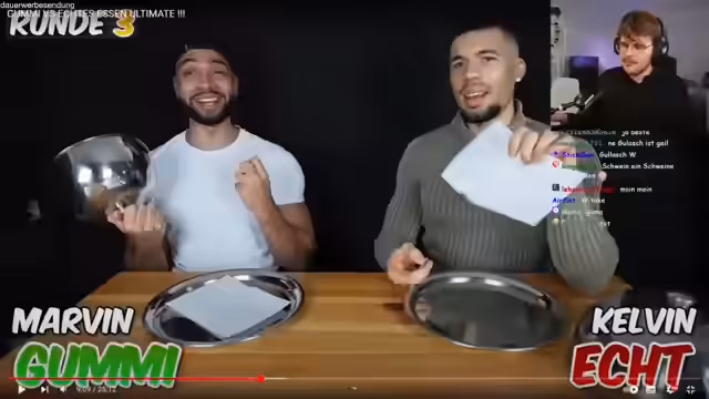 01:08:38Der Streamer schaut sich ein Video der Prankbros an, in dem es um GUMMI VS. ECHTES ESSEN geht. Er erinnert sich daran, dass die neue Prämmamiel-Box an die alte Adresse geschickt wurde. Es wird überlegt, was mit der Adresse des Streamers angefangen würde, wenn sie bekannt wäre. Der Streamer schaut sich das Intro des Prankbros-Videos an und fragt die Zuschauer, ob sie Team Calvin oder Team Marvin sind. Er identifiziert sich eher mit Marvin. Es wird erklärt, dass die Prankbros schon fast alles an Essenssachen durchprobiert haben und es schwierig ist, neue und krasse Sachen für das Format zu finden. Es wird angekündigt, dass es eine neue Folge GUMMI VS. ECHTES ESSEN geben wird, wenn das Video 15.000 Likes erreicht. Die Prankbros bitten um Tipps für krasse Sachen, die sie für das Format besorgen können. Im Video wird die erste Runde GUMMI VS. ECHTES ESSEN gespielt, bei der es um einen Gummibären und einen Schokobären geht.