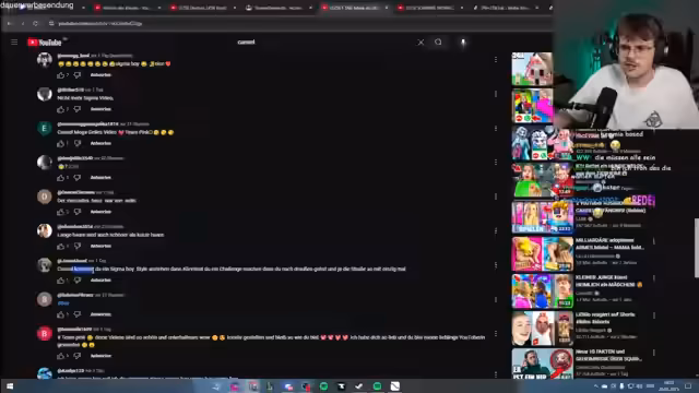 00:12:50Die Aufmerksamkeit wandelt sich zur Analyse aktueller YouTube-Trends. Es werden mehrere absurde Virals wie 'Squid Game Wächter macht Heiratsantrag' und '14 Stunden im Auto' kommentiert. Besonders der 'Sigma Boy'-Trend wird ausführlich besprochen und die Authentizität der Kommentare und Videos hinterfragt. Streamer und Zuschauer sind sich einig, dass solche Inhalte oft künstlich erzeugt sind und fragen sich, ob es sich um Bots oder sehr junge Nutzer handelt.