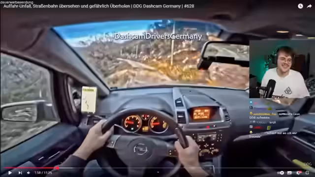 00:39:09Der Fokus des Streams verlagert sich endgültig auf den Hauptinhalt, die Reaktion auf Videos von 'Dashcam Drivers Germany'. Es werden verschiedene Dashcam-Fahrszenen analysiert und bewertet. Themen sind riskantes Überholen, Verkehrsverstöße und ungewöhnliche Verkehrssituationen. Der Streamer gibt seinen Senf zu den Kommentaren der Videos und diskutiert Fahrfehler sowie die möglichen Konsequenzen. Auch persönliche Anekdoten zu eigenen Fahrerfahrungen werden geteilt.