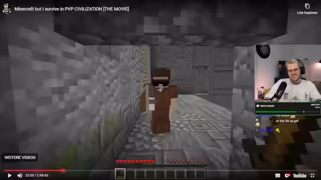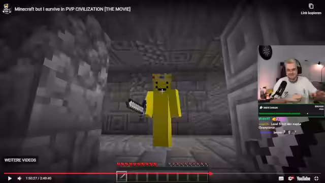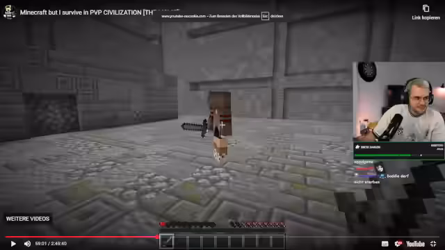 02:13:32Die Frau und der Spieler schließen sich zusammen, um einen Gegner mit Lederrüstung und ständiger Hungerregeneration zu bekämpfen. Trotz ihrer Bemühungen wird der Kampf von Beginn an als aussichtslos empfunden, da der Gegner durch seine Ausrüstung und ständige Lebensregeneration einen enormen Vorteil besitzt und den Kampf zu kontrollieren scheint.
