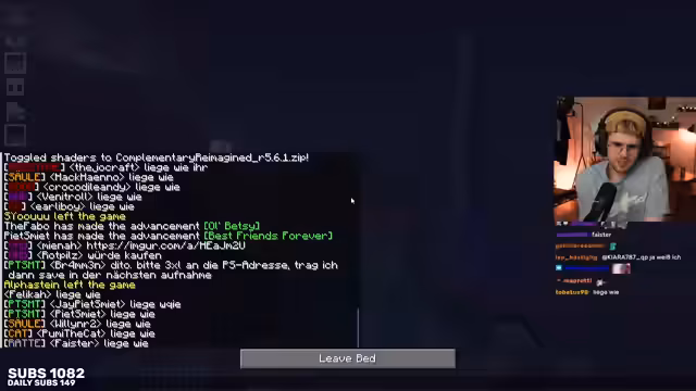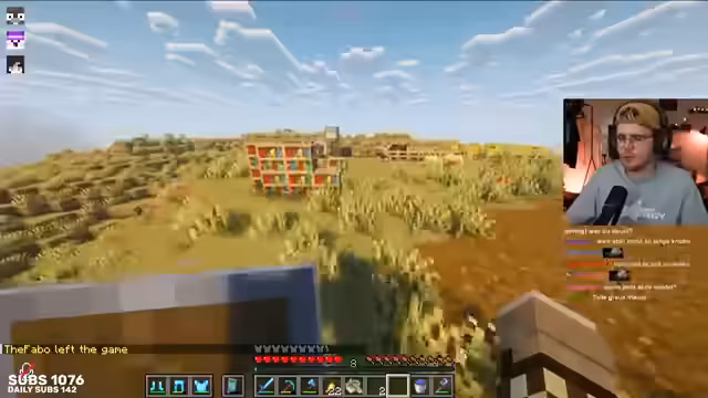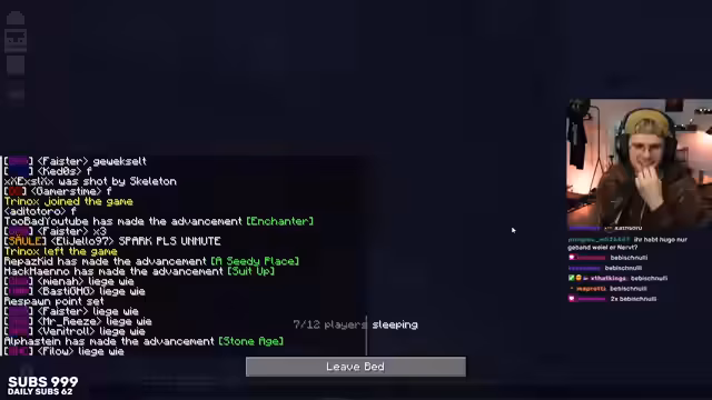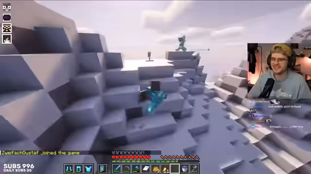 08:22:53Es wird die Frage gestellt, wann der Streamer offline gehen wird, wobei die Entscheidung einem Zuschauer überlassen wird. Der Streamer äußert leichte Schmerzen im Brustbereich und erwägt einen Arztbesuch aufgrund einer möglichen Muskelverspannung. Die Suche nach einem Dorf und Dorfbewohnern in Minecraft gestaltet sich schwierig, da der Streamer bereits sehr weit in eine Richtung gegangen ist. Es wird diskutiert, wie man Dorfbewohner für Fortune-Verzauberungen finden und vermehren kann, wobei Brot und Betten als Mittel zur Vermehrung genannt werden. Die Möglichkeit, Villager von anderen Spielern zu "abzuzwacken", wird in Betracht gezogen, insbesondere von Fabo, der jedoch möglicherweise verärgert ist.