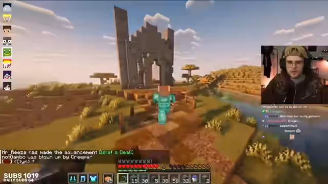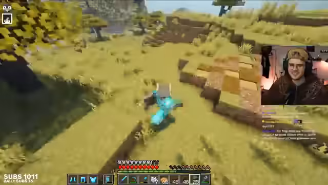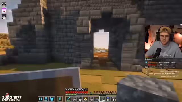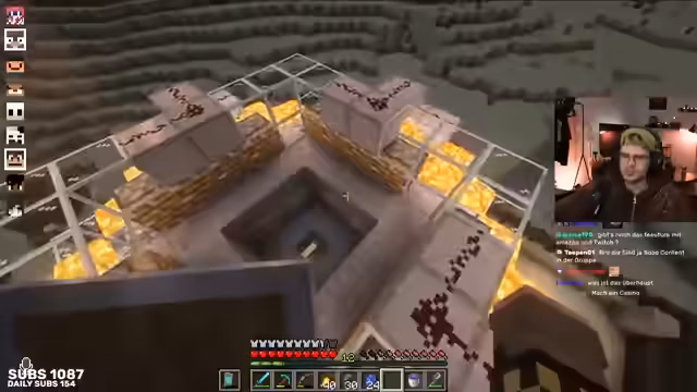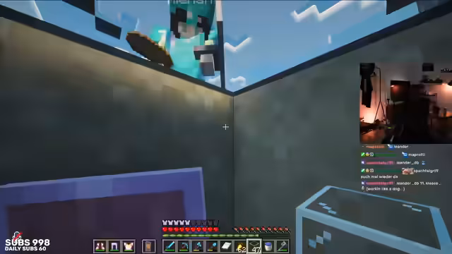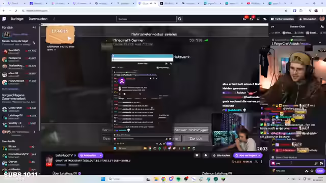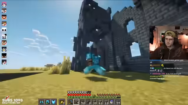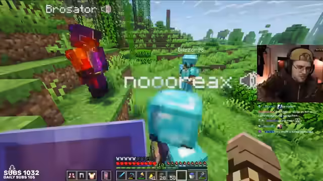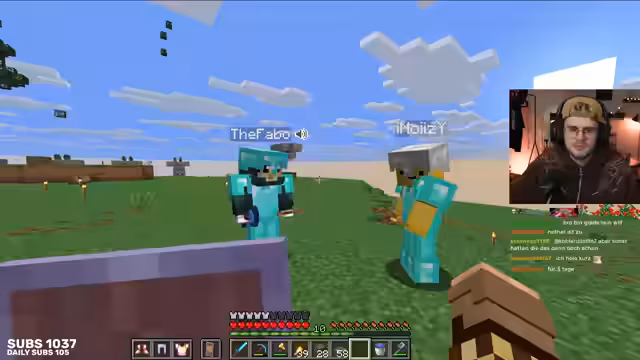 01:33:20Während der Erkundung interagiert der Streamer mit verschiedenen Gameplay-Elementen. Er kämpft gegen aggressive Kreaturen wie den 'Meg-Sviech' (Mobs), sammelt Ressourcen wie Diamanten und Wolle und zeigt den Prozess des Bettbaus. Die interaktion mit anderen Spielern wie CrocodileAndy, der als 'bumst' beschrieben wird, und Kevin, der Orientierungsprobleme hat, steht im Fokus. Parallel dazu klärt er technische Fragen der Zuschauer, z.B. zur Steuerung der Third-Person-Perspektive. Er nennt sich selbst 'Minecraft-Pro' und navigiert durch die Spielmechaniken, während er auch die Schadenswerte von Angriffen kommentiert und versucht, die neuesten Gameplay-Features zu verstehen.
