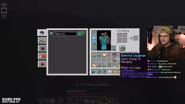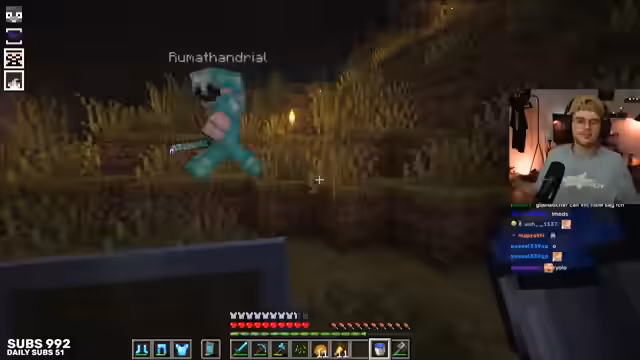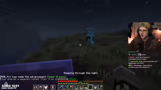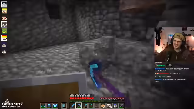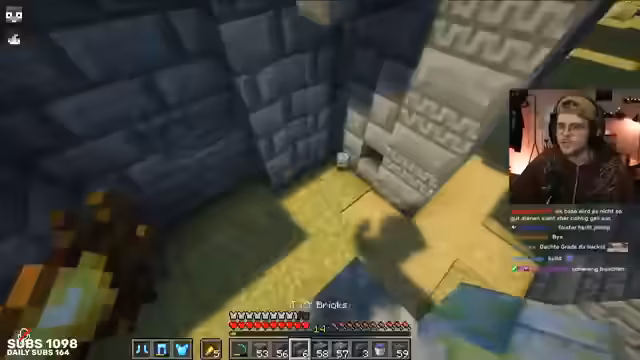 09:16:23Der Streamer beschäftigt sich mit dem Verzaubern seiner Werkzeuge in Minecraft. Er erwähnt, dass Effizienz 4 auf der Spitzhacke in Ordnung sei und er bereits Unbreaking darauf erhalten habe. Für ein Schwert hat er Feuer Aspekt und Schärfe 4 bekommen, was ihn auf Level 29 bringt. Um weitere Level zu farmen, überlegt er, Quarz abzubauen oder mit Villagern zu handeln, stellt jedoch fest, dass es außer zwei Villagern in einem Block keine weiteren in der Nähe gibt. Er erwägt, Kühe zu züchten, um Level zu gewinnen. Ein Mitbewohner bringt ihm selbstgemachte Quarkbällchen, die er probiert und deren Süße bemerkt. Es wird eine TikTok-Referenz zu Quarkbällchen gemacht, die der Streamer nicht kennt.