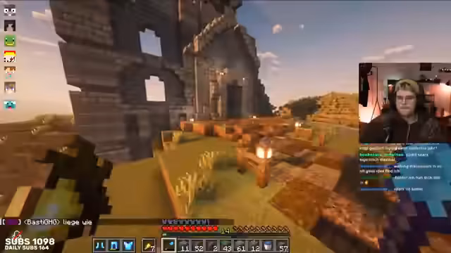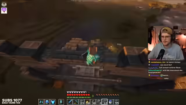 09:57:10Der Streamer orientiert sich beim Bau der Kirche an einem Elden Ring Screenshot, um einen viereckigen Turm zu errichten. Es wird humorvoll auf Fragen reagiert, warum er kein Craft Attack spiele, obwohl er sich in der Minecraft-Kategorie befindet. Er bemerkt, dass angepinnte Nachrichten bei Handy-Usern oft untergehen. Es wird über die geringe Anzahl von Fragen zu Max, einem anderen Streamer, gesprochen, der selbst live ist. Der Streamer plant, später am Abend oder in der Nacht weiterzuspielen, je nach Müdigkeit. Es wird erwähnt, dass das Wort 'Palle' im Chat automatisch moderiert wurde, da es auf Italienisch 'Eier' bedeutet. Er plant, ein Schwein mit einem Seil aus dem Wasser zu ziehen, um es zu transportieren.