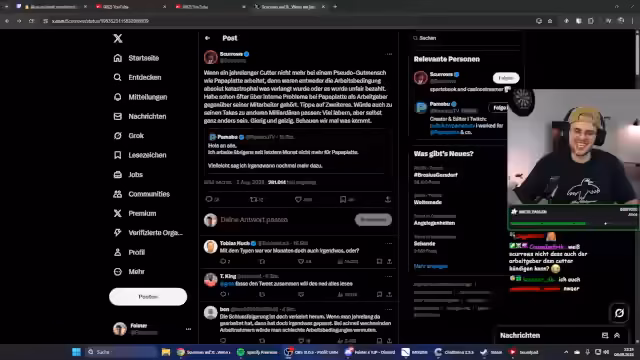00:13:15Ein wichtiges Thema ist die Ankündigung, dass der Streamer nicht mehr für 'Papa Platte' arbeitet. Dieser Tweet löst Diskussionen aus über mögliche Gründe wie schlechte Arbeitsbedingungen oder Bezahlung. Kurz darauf wird ein weiteres Thema auf Twitter angesprochen: Wilbo, der angeblich 10.000 Euro im Monat im Teilzeitjob verdient. Der Streamer gibt an, von Wilbo blockiert worden zu sein, und die Thematik sei ihm egal.