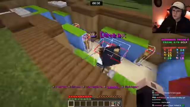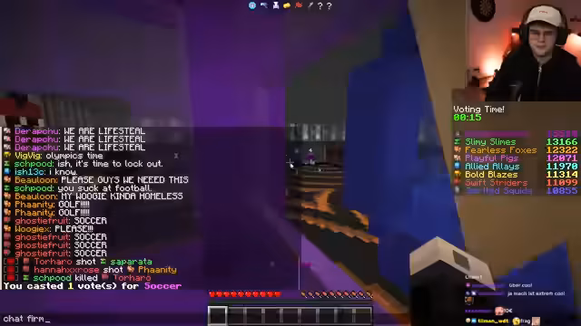 02:40:44Die nächste Disziplin ist ein Fußball-Spiel in Minecraft, bei dem Eisengolems als Tore dienen und der Ball ein geschossener Pfeil ist. Es wird eine Taktik erarbeitet: Lenny ist Torwart, während andere im Angriff agieren. Die Spieler trainieren das Schießen des Balls und das Sammeln nach einem Treffer. Die Partie wird durch technisch unfaire Momente und Ping-Probleme erschwert, was zu Frustration führt. Dennoch bleibt das Team in der Gesamtwertung in Führung, trotz einiger verpasster Chancen und gefühlter Ungerechtigkeiten.