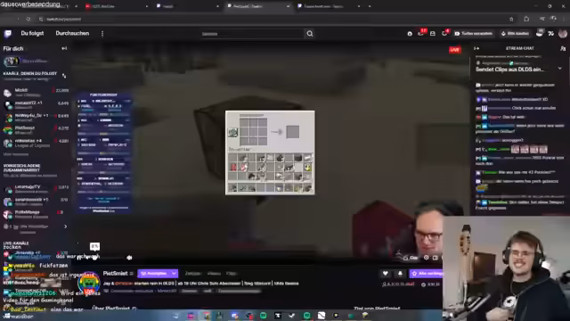 00:59:00Der Streamer bereitet sich auf das Minecraft-Event mit Jay vor und bespricht die notwendigen Einstellungen und Mods. Er fragt Jay, ob er alle Misches bereit hat und welche Version von Minecraft sie spielen. Es wird geklärt, dass nur Sodium, Optifine und Brightness Mod erlaubt sind. Der Streamer schlägt verschiedene Teamnamen vor, darunter "Peter Sacks", "Team Artikel 13" und "Team Peter Schmidt", um PietSmiet zu ärgern. Sie einigen sich schließlich auf "Team Peter Schmidt". Der Streamer lädt Jay in das Team ein und startet die Aufnahme. Er erklärt, dass sie alles mit Twitch-VODs machen und keine separaten Aufnahmen starten. Es wird kurz überlegt, ob ein Overlay eingeblendet werden soll, aber der Streamer entscheidet sich dagegen. Sie besprechen den Plan für den Start in Minecraft: Essen besorgen und Schilde craften, um nicht zu sterben. Der Streamer äußert Bedenken, dass Jay sterben könnte. Der Chat weist darauf hin, dass Zoom verboten ist, woraufhin der Streamer ankündigt, es zu deaktivieren.