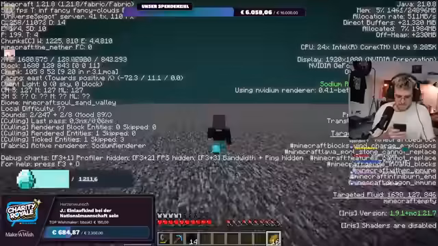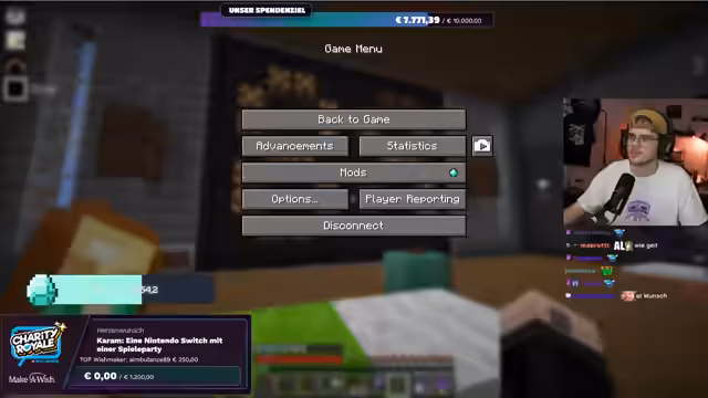 05:53:35Der Stream konzentriert sich intensiv auf das Charity-Ziel, bei dem 5 Euro eine Diamantenfarm auf dem Server ermöglichen. Der Streamer berichtet über seine Fortschritte beim Farmen, die Sammlung der Diamanten und die positive Stimmung im Chat. Gleichzeitig erwähnt er persönliche Updates, wie sein Trainingsprogramm, bei dem er aktuell 70 Kilogramm auf seiner Bank drückt und sein Ziel, die 80-Kilogrammarke zu erreichen. Die Stimmung ist motiviert und der Fokus liegt auf dem gemeinsamen Ziel, für den guten Zweck so viel wie möglich zu sammeln.