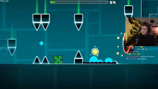 00:20:04Der Streamer startet sein Spiel bei X-Step, einem anspruchsvollen Level. Er zeigt trotz mehrerer Todesfälle großes Durchhaltevermögen und nimmt Tipps aus dem Chat an, um seine Techniken zu verbessern. Dabei diskutiert er über Pro-Einstellungen und trainiert einen neuen Double-Jump, um das Level zu meistern, was seine Weiterentwicklung demonstriert.
