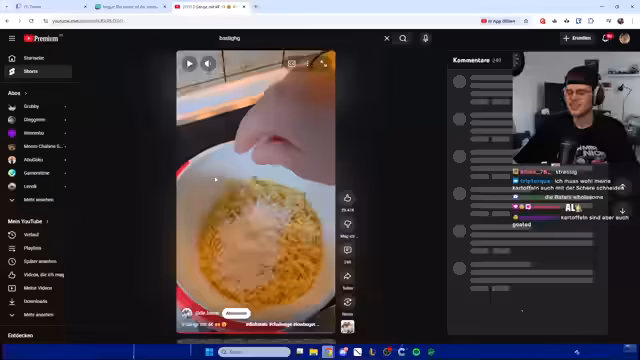 00:28:23Faister beginnt eine neue Challenge: Er muss mit 4 Euro ein 3-Gänge-Menü zubereiten. Er wählt den Penny-Markt als Ziel, beschafft sich Kartoffeln, Mehl und Zucker und beginnt sofort in seinem Streamstudio, die Gerichte zuzubereiten. Nebenbei unterhält er sich mit dem Chat über verschiedene Themen. Nachdem er das Essen fertiggestellt hat und sich kurz den technischen Einstellungen für den Shader gewidmet hat, startet er endlich in die Minecraft-Welt in der Version 1.21.11.