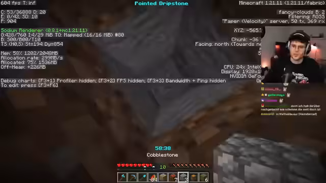 05:12:12Die Suche nach den notwendigen Ressourcen wird zur zentralen Herausforderung. Nachdem der Streamer ein Dorf mit einem Ofen findet, muss er feststellen, dass der Ofen nicht im Dorf zurückgelassen wurde, was ihn extrem frustriert. Er beschließt daraufhin, einen weiteren Ofen aus einem anderen Dorf zu holen. Gleichzeitig beginnt er, mit seinen Chattern über die Entstehung von Sauerstoff im Nether zu diskutieren, was den humorvollen und eher unkooperativen Charakter des Streams unterstreicht. Die Verzweiflung steigt, als er Pointed Dripstone für ein weiteres Item benötigt und in riesigen Lush Caves vergeblich sucht.