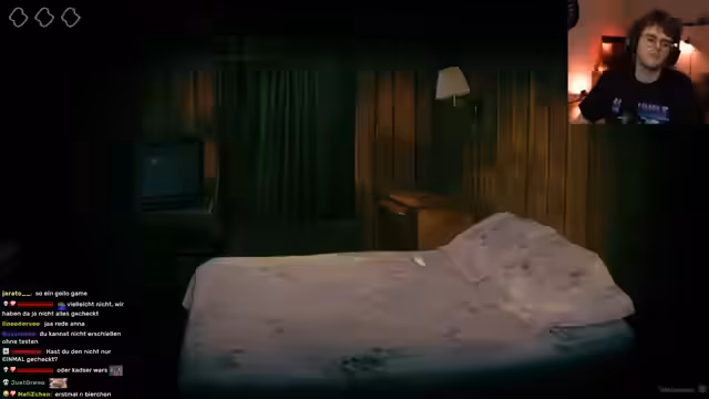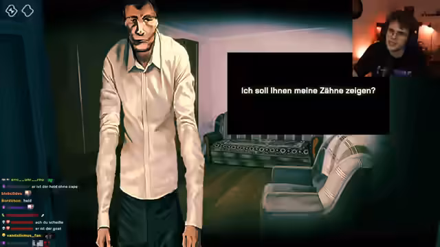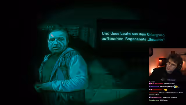 00:38:05Der Stream interagiert intensiv mit den ersten beiden Hausgästen. Einer ist ein mürrischer, alkoholischer Müllmann, der nach einer Auseinandersetzung mit seinen Freunden einquartiert wird. Der andere ist ein ominöser, bleicher Mann mit Helm, der sich seltsam verhält. Parallel dazu erweitert das Spiel die Bedrohungen: Es werden neue Merkmale für Besucher eingeführt – blutrote Augen und haarlose Achselhöhlen – und eine Quarantäne ausgerufen, die die Handlung weiter verschärft.