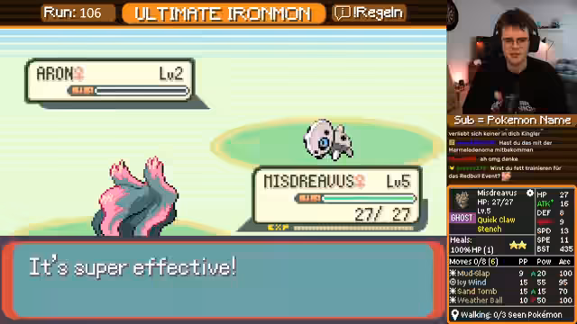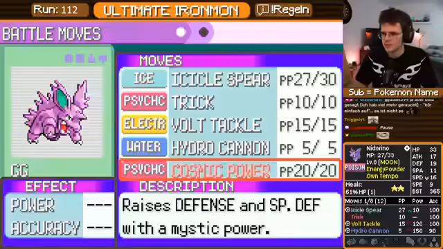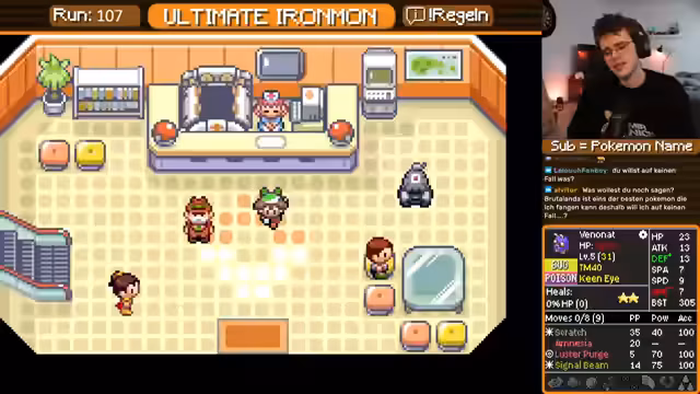 00:24:12Das Gameplay von Ultimate Ironmon wird als sehr fordernd dargestellt. Der Streamer kämpft sich durch die Arenen, muss dabei aber ständig auf seine begrenzten Ressourcen wie Heiltränke achten und ist bei bestimmten Pokémon-Typen, insbesondere Geist-Pokémon, extrem anfällig. Er äußert sich frustriert über die zufälligen Stats seiner Pokémon, die den Run oft unlösbar machen. Trotzdem wird der Run weiterverfolgt und es wird überlegt, ob man ein zweites Pokémon für bestimmte Situationen, wie den Doppelkampf in der Arena, nutzen darf.
