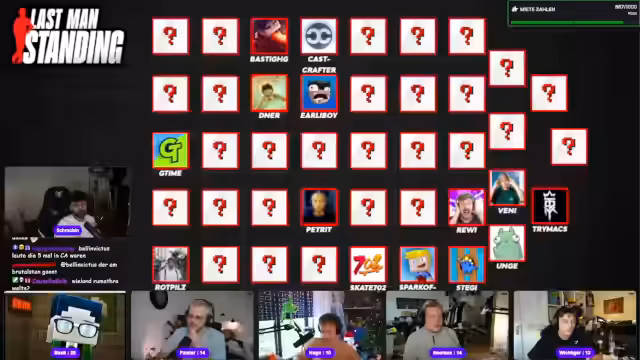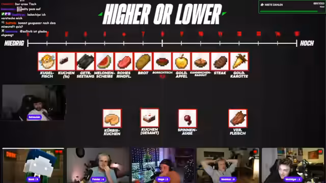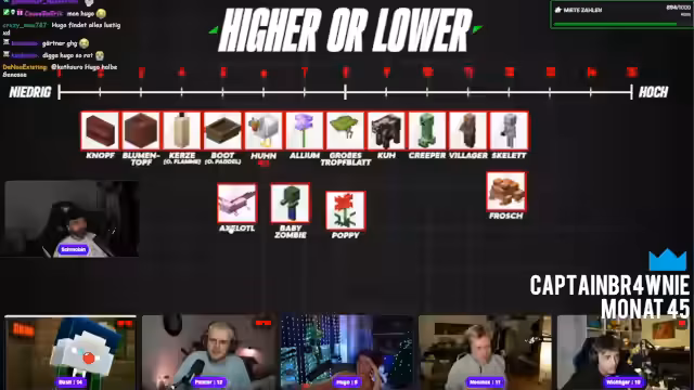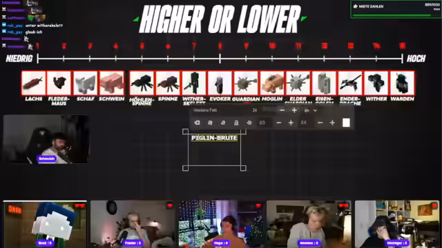 08:02:41Die erste 'Higher or Lower'-Kategorie dreht sich um die Lebenspunkte von Minecraft-Mobs. Die Teilnehmer müssen verschiedene Monster nach ihrer Größe oder HP ordnen. Die Moderation fordert die Spieler auf, ihre Platzierungen zu nennen. Obwohl einige Reihungen korrekt sind, kommt es zu Fehlern bei der Einordnung, was zu Kommentaren wie 'peinlich' und 'krass' im Chat führt und den Wettbewerbscharakter unterstreicht.