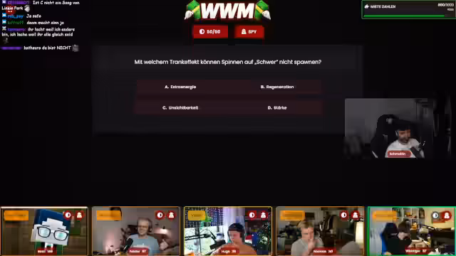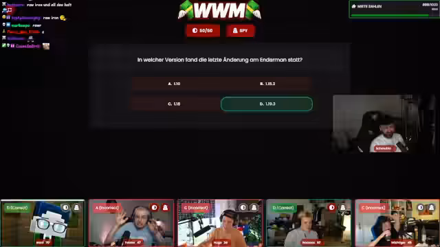 07:01:38Das Haupt-Quiz beginnt mit anspruchsvollen Minecraft-Fragen, die sowohl triviales Wissen als auch tieferes Gameplay-Wissen abfragen. Die Teilnehmer nutzen die Joker strategisch, besonders der Spy-Joker sorgt für Spannung, da er Einblicke in die Entscheidungen der Gegner bietet. Die Fragen werden zunehmend komplex und gehen von Versionssprüngen über Chunk-Koordinaten bis hin zur Seltenheit bestimmter Mobs, wobei es zu einigen Fehleinschätzungen und spannenden Momenten kommt.