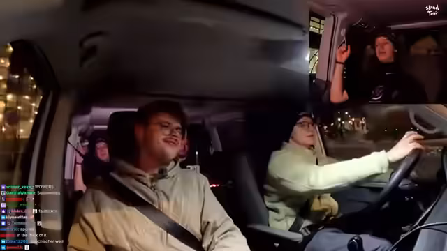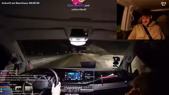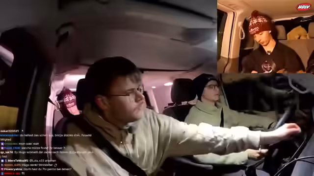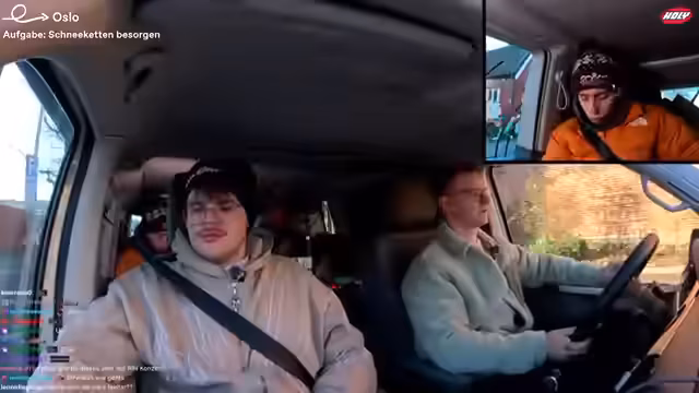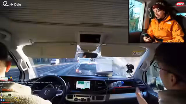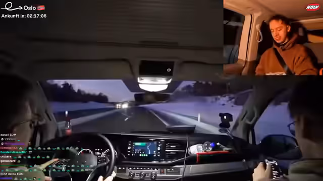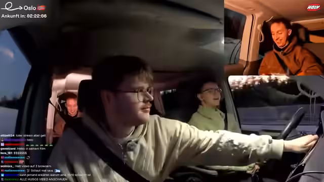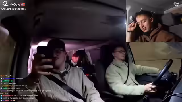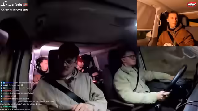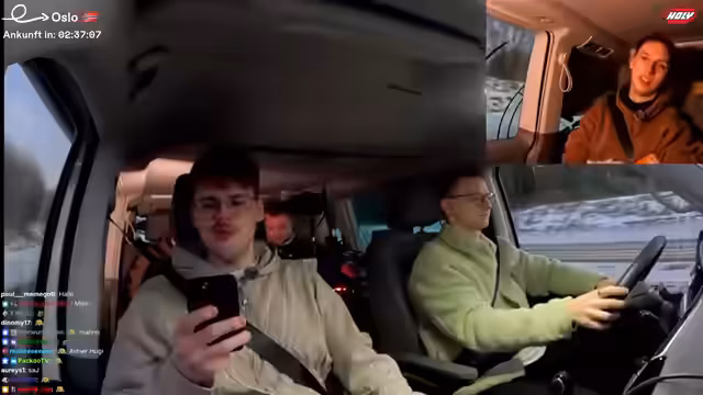 11:49:06Die Gruppe führt spontane Tests durch und beschäftigt sich damit, wer der 'unnötigste' Mensch auf der Tour sei. Danach werden die Pläne für den Abend konkretisiert: Alle müssen im Baumhaus bleiben. Die Fahrstrecke nach Oslo wird als etwa eine Stunde und zehn Minuten veranschlagt. Die Stimmung ist gelassen, und die Streamer unterhalten sich während der Fahrt, wobei sie Heiko mit seinem Fahrstil aufziehen.