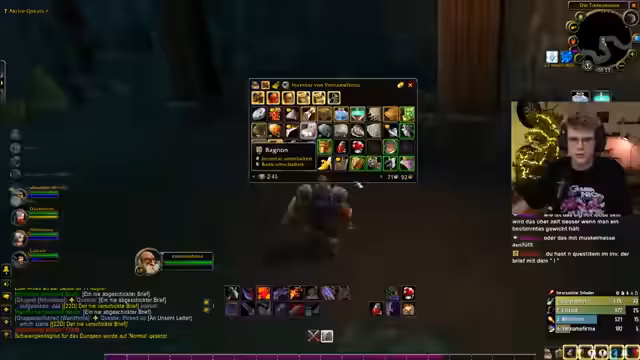 02:38:22Der Streamer bespricht mit seinem Team die Notwendigkeit separater Ausrüstungssets für verschiedene Dungeons wie Goldhain und Insel. Es geht um den Verkauf von Roben aufgrund eines RP-Entscheids und die Optimierung von Waffenstats (z.B. 20-39 Schaden vs. 11,1 DPS). Parallel bereitet sich die Gruppe auf ein großes WoW-Event vor, diskutiert Klassenkombinationen (Krieger, Schurke, Jäger, Priester, Mage) und bestätigt Teilnehmer wie Masat (Jäger), Tamina (Schurke) und Timoros (Mage).