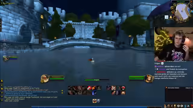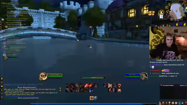 03:07:56Der Streamer entdeckt das Angel-Feature und fängt versehentlich einen Fisch. Es geht um die Jagd nach 'Deviat-Fischen', die bei Verzehr in Piraten- oder Ninja-Kostüme verwandeln. Diese Seltenheiten sind Ziel einer Absprache mit Wieland, der als 'Angelking' für die Gruppe fischen soll. Humorvoll wird die hohe Rareität eines speziellen Rings in Hauptstädten diskutiert (0,01% Chance), der vor allem wegen seiner Seltenheit begehrt ist, nicht wegen Stats.