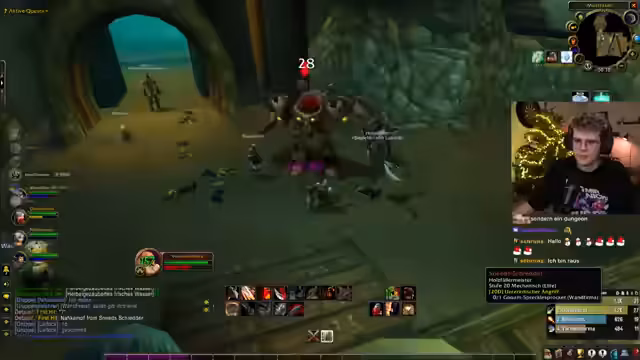 01:45:08Das Team betritt den Dungeon und beginnt mit den ersten Pulls. Der Streamer (als Tank) wird von Sarah und dem neuen DPS unterstützt. Es gibt erste Herausforderungen: Der Streamer stirbt beinahe, wird aber durch Heilung gerettet. Die Gruppe nutzt Klassenfähigkeiten wie Frost Nova und Taunt, um Mobs zu kontrollieren. Strategische Absprachen erfolgen, wie das separate Pullen von Gegnern, um Überwältigung zu vermeiden. Die Teamdynamik verbessert sich nach anfänglichen Verwirrungen.