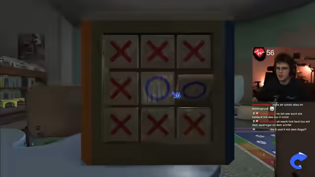 02:53:48Nach dem Absolvieren eines Puzzels auf dem Sofa wird ein neues Band mit einem Tick-Tack-Toe-Schrank freigeschaltet. Nachdem mehrere Markierungen entdeckt werden, erkennt der Streamer, dass die Lösung darin besteht, die Symbole XOO in einer Reihe zu platzieren. Diese Erkenntnis ist entscheidend, um das Rätsel zu lösen und den weiteren Spielverlauf zu ermöglichen, was eine kurze Erleichterung bringt.