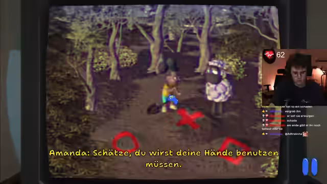 01:31:29Nach der erfolgreichen Reise nach Paris wird das nächste Rätsel auf einer VHS-Kassette präsentiert. Die Aufgabe besteht darin, verschiedene Objekte wie Muffin, Apfel und Milch in die richtige Anordnung auf einem Tisch zu sortieren. Nach einigen Fehlversuchen, die zu einem Tode der Spielfigur führen, wird das Rätsel gelöst. Die neue Herausforderung ist ein weiteres Video, das drei Figuren zeigt, die nicht sehen, nicht sprechen und nicht hören können. Der Streamer muss durch gezielte Aktionen, wie das Verdecken der Ohren und Augen der Figuren, das Rätsel lösen und dabei die Nerven bewahren.