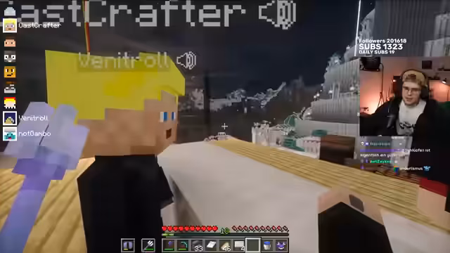 02:52:32Es wird eine kurze Diskussion über die Charaktere aus der Twilight-Saga geführt, insbesondere über Edward und Jacob, wobei die Rollen als Vampir und Werwolf geklärt werden. Die Verwirrung um Cedric Diggory aus Harry Potter, der vom selben Schauspieler wie Edward gespielt wurde, wird ebenfalls angesprochen. Der Streamer äußert den Wunsch, Twilight noch einmal anzuschauen, um die Zusammenhänge besser zu verstehen. Anschließend wechselt das Thema zu Minecraft-Bauprojekten, insbesondere dem Terraformieren von Minas Tirith. Ein Teammitglied, Space, hat ohne Absprache eine Treppe in ein bestehendes Kunstwerk gebaut, was zu einer humorvollen Beschwerde führt, da der Streamer das ursprüngliche Design mochte. Es wird erklärt, dass die Treppe Teil des Bauplans ist, auch wenn sie nicht auf der Blue Map verzeichnet ist. Die Situation wird mit dem Malen eines Gemäldes verglichen, in das jemand plötzlich hineinmalt, was die Frustration verdeutert. Trotzdem wird die Arbeit fortgesetzt, und es wird die Möglichkeit eines Besuchs auf dem Kölner Weihnachtsmarkt in Betracht gezogen.