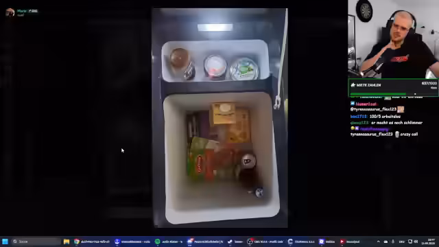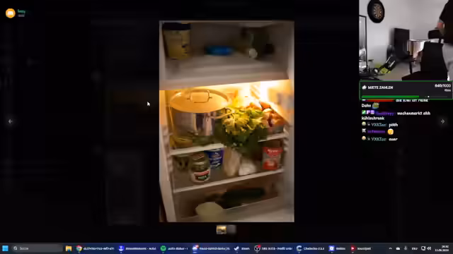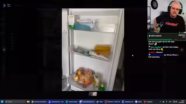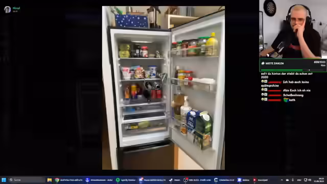 02:16:56Die Zuschauer präsentieren ihre Kühlschränke aus unterschiedlichen Lebensphasen. 'Lena' zeigt einen sehr biomäßigen Kühlschrank ihrer WG, während 'Marie' im Studentenwohnheim lebt und nur eine Kühlbox mit Instant-Nudeln vorweisen kann. Ihre Situation als Studentin mit nur 315 Euro Miete im Monat, aber ohne eigenen Herd, wird als sehr bescheiden und fordernd beschrieben, was zu großer Wertschätzung und Mitgefühl im Stream führt.